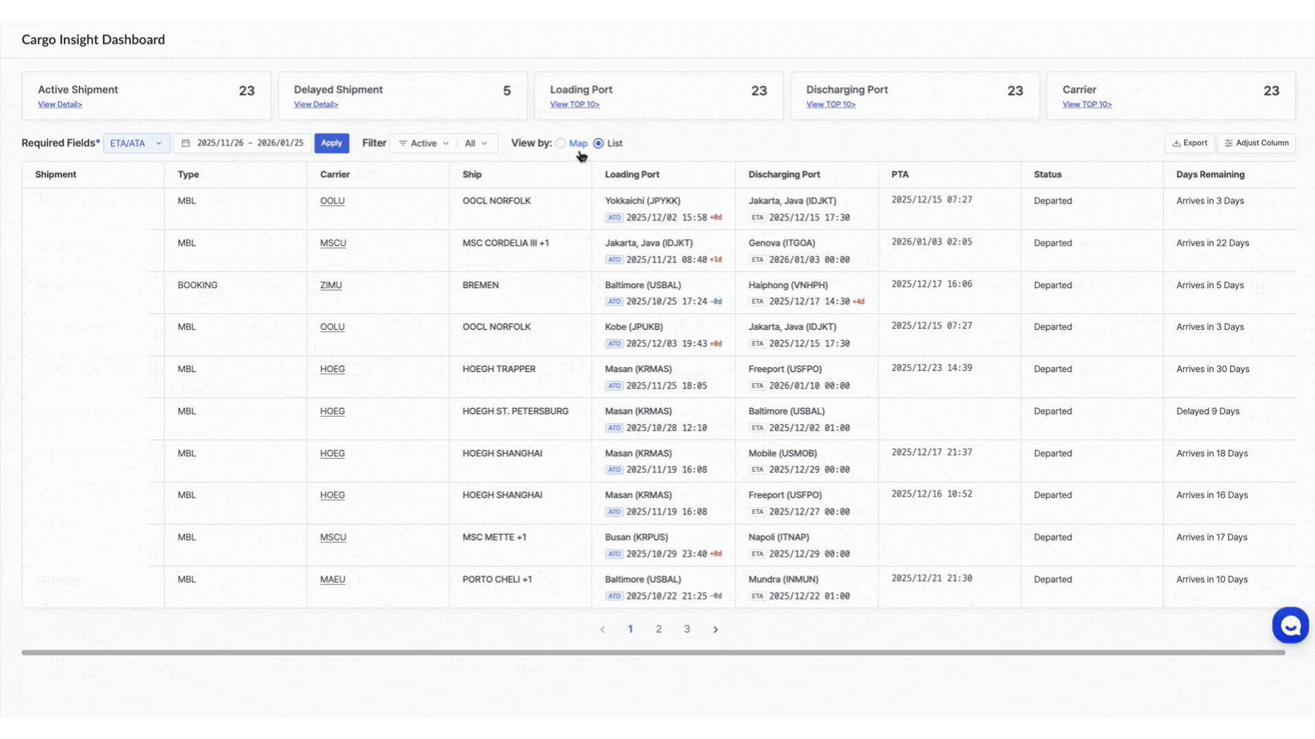 Now you can toggle seamlessly between List Mode for deep operational details (timestamps, POL/POD) and Map Mode for a global overview of vessels and your shipments